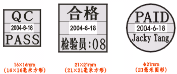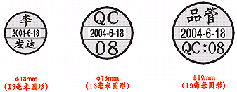 日期印章耐用,耐油,制作簡便,圖文清晰,可反復使用。適用于工廠、倉庫、銀行財務系統(tǒng)。一般客戶用的大都是圓型的小印章,中間有日期,有中文及英文兩種,日期可調,而且本產品20mm以內直徑的自帶印臺及盒子,有五種顏色選擇。(尺寸選擇13mm-42mm)