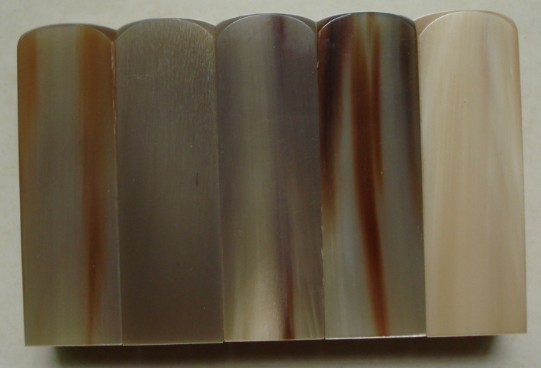 牛角是近代人民普遍采用的印材,黃牛角呈黑色,水牛角呈灰黃色或灰褐色,質(zhì)地堅韌,不為人工手刻者所喜愛,卻是機器雕刻的好印材,黑色角質(zhì)印材有光澤,灰黃色;液稚珓t少。牛角印材輕便而不易碎,為現(xiàn)代工商企業(yè)和機關部門制印所歡迎。現(xiàn)廣東全省銀行系統(tǒng)所用的“財務專用章”和企業(yè)法人代表章,一般常用牛角刻制和銅質(zhì)印章。有用純天然牛角的,也有用仿牛角料的。純牛角印材還適合做藝術章,有人認為牛角入印,有吉祥象征,故現(xiàn)代私章取牛角印料者甚多。